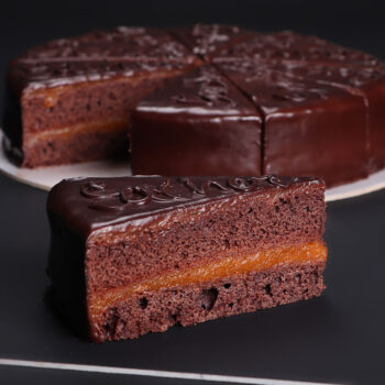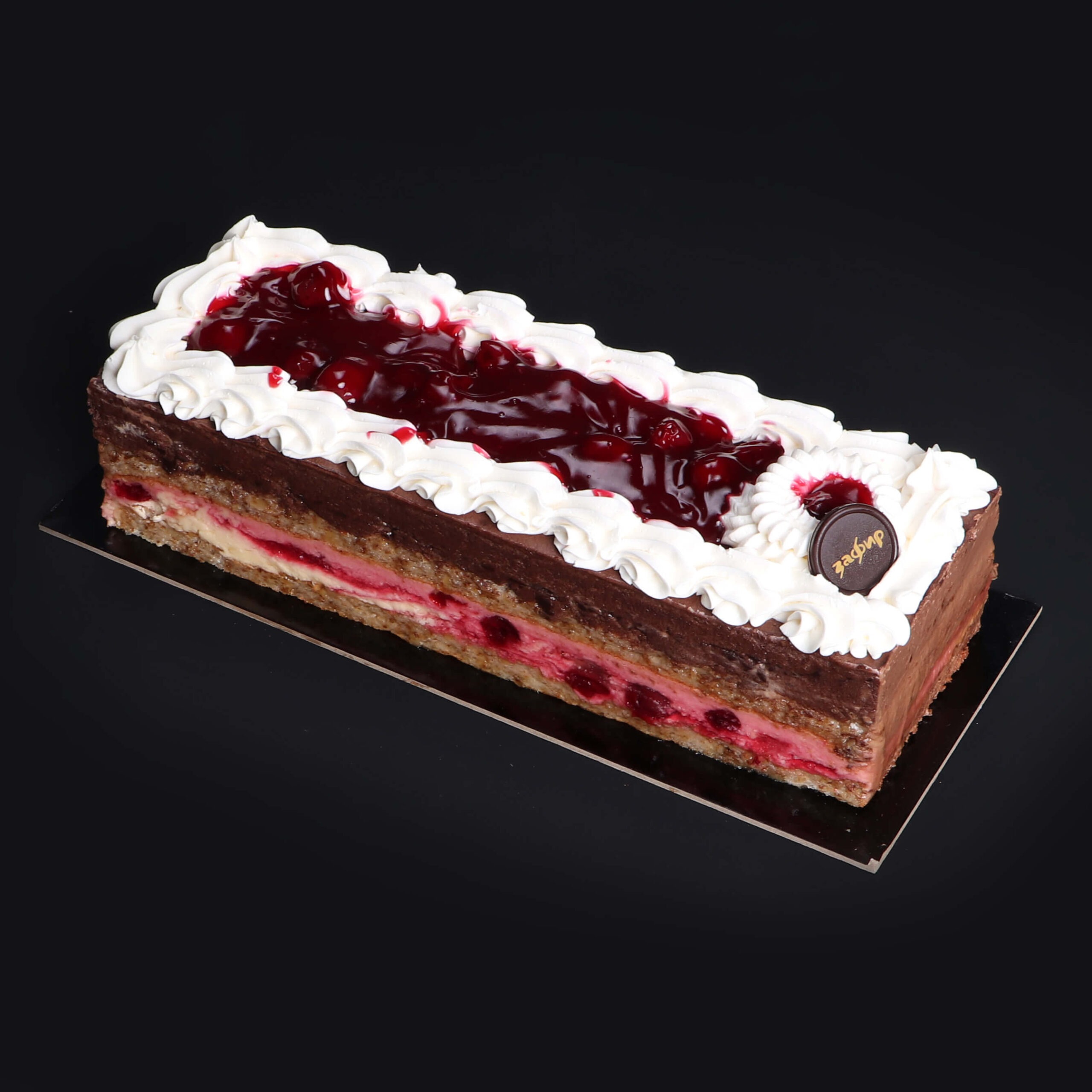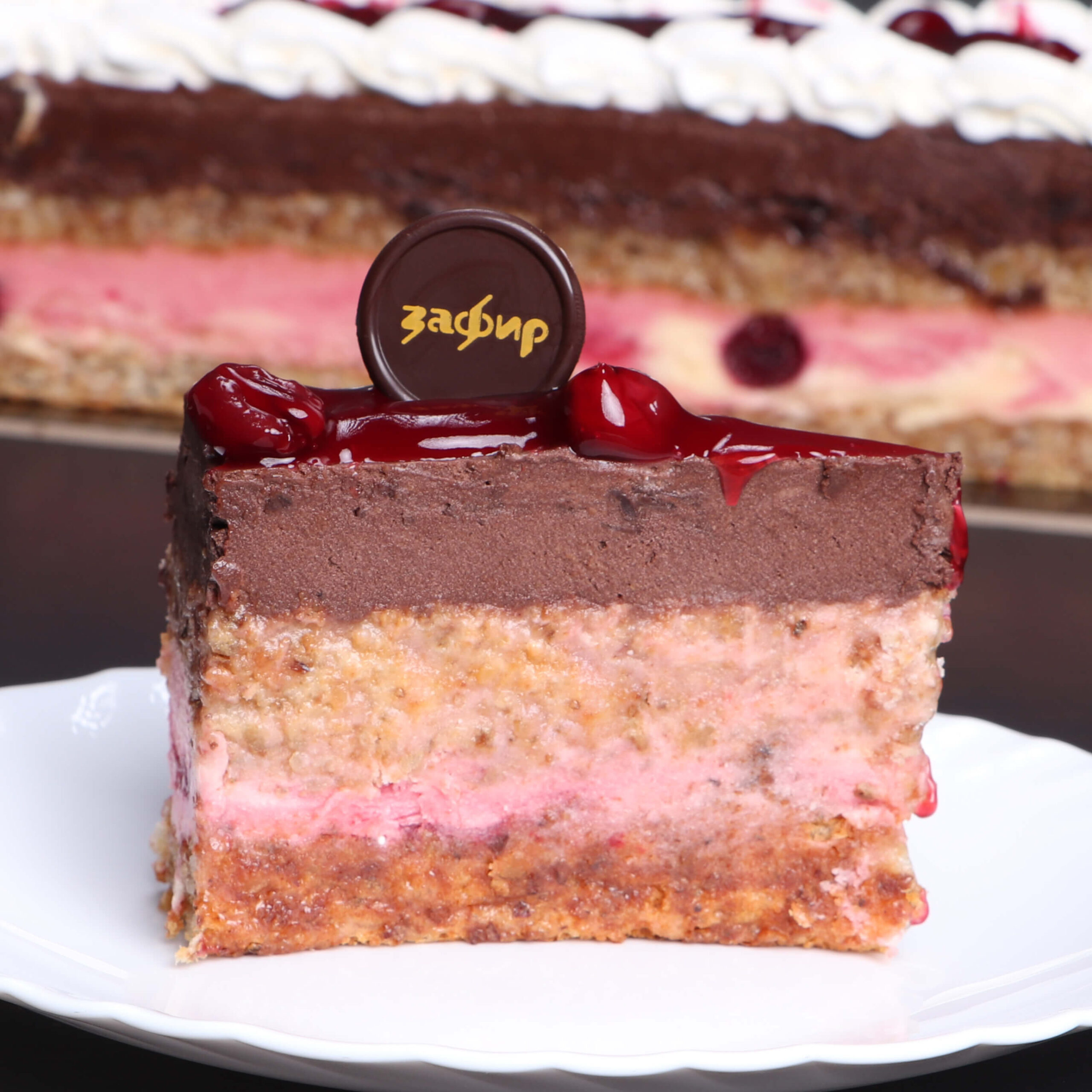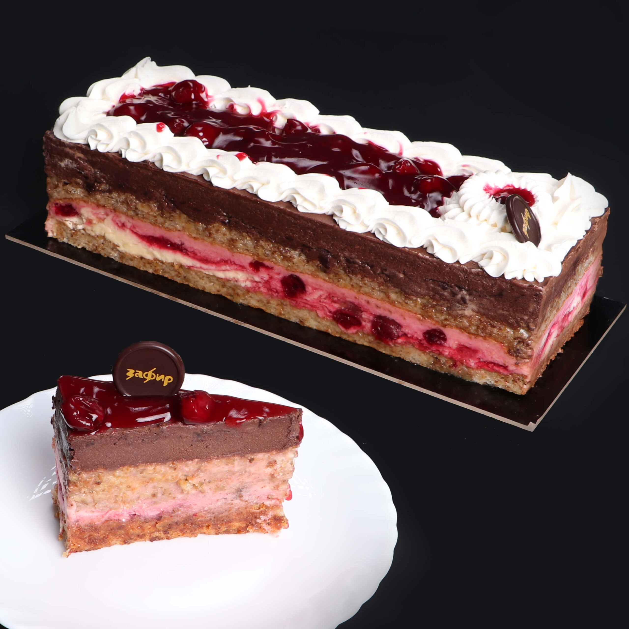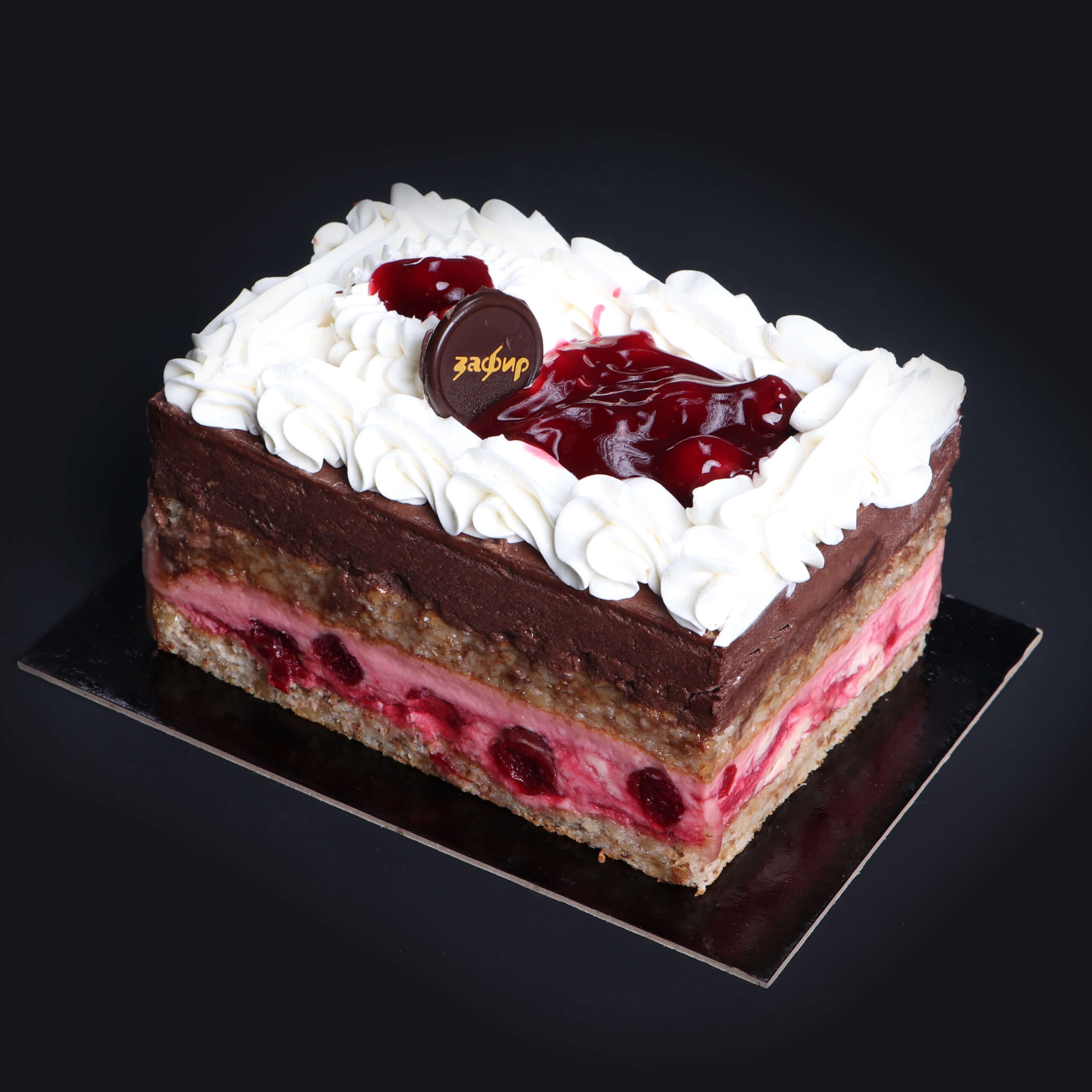 Кори од белки со ореви и ванила, еден фил од бело чоколадо со слатко од вишни и втор од црно чоколадо, прелиена со бордо глазура од бело чоколадо.